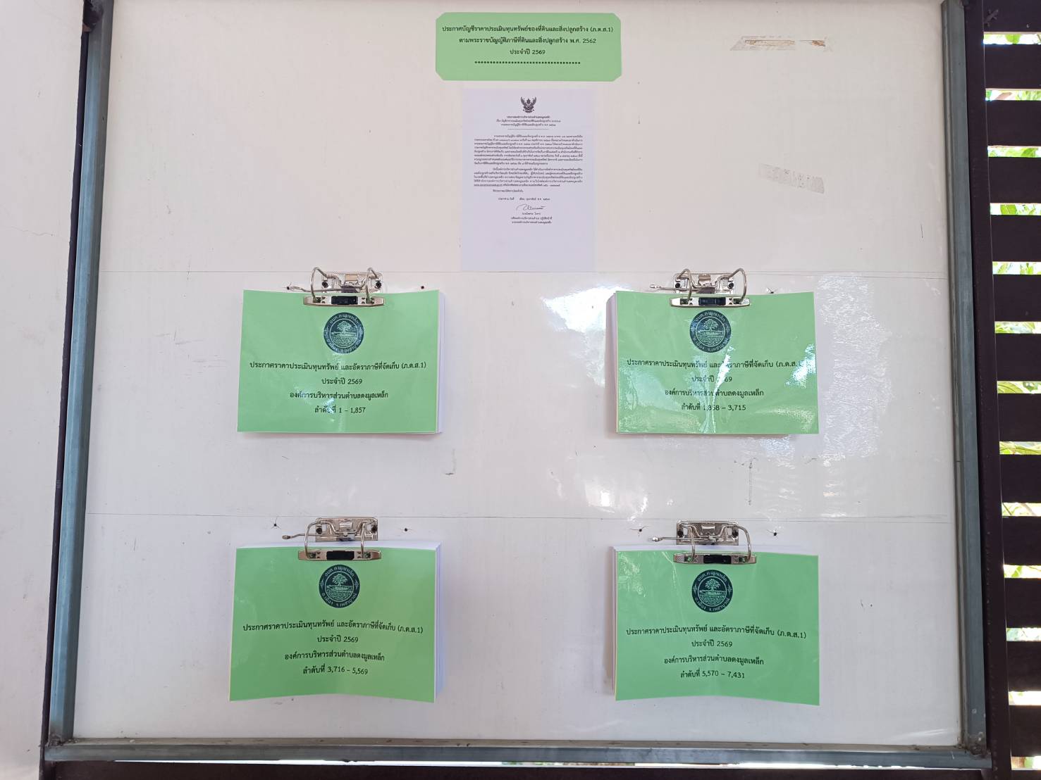 บอร์ด ประกาศองค์การบริหารส่วนตำบลดงมูลเหล็ก เรื่อง บัญชีราคาประเมินทุนทรัพย์ของที่ดินและสิ่งปลูกสร้าง (ภ.ศ.ส.ส.ล)